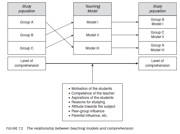 Let us take another example. Suppose you want to study the impact of different teaching models on the level of comprehension of students for which you adopt a comparative study design. In this study, the change in the level of comprehension, in addition to the teaching models, can be attributed to a number of other factors, some of which are shown in Figure 7.2:
