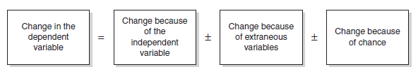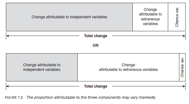As the total change measures the combined effect of all three components it is difficult to isolate the individual impact of each of them (see Figure 7.3). Since your aim as a researcher is to determine the change that can be attributed to the independent variable, you need to design your study to ensure that the independent variable has the maximum opportunity to have its full effect on the dependent variable, while the effects that are attributed to extraneous and chance variables are minimised (if possible) or quantified or eliminated. This is what Kerlinger (1986: 286) calls the ‘maxmincon’ principle of variance.