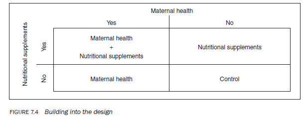 - Build the affecting variable into the design of the study – To explain this concept let us take an example. Suppose you want to study the impact of maternal health services on the infant mortality of a population. It can be assumed that the nutritional status of children also has a marked effect on infant mortality. To study the impact of maternal health services per se, you adopt a two-by-two factorial design as explained in Figure 7.4. In this way you can study the impact of the extraneous variables separately and interactively with the independent variable.