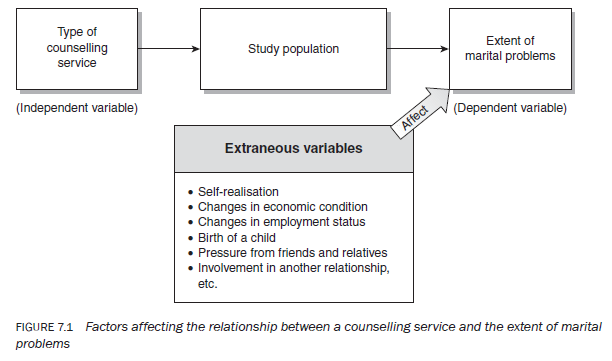 Suppose you want to find out the effectiveness of a marriage counselling service provided by an agency — that is, the extent to which the service has been able to resolve the marital problems of its clients. In studying such relationships you must understand that in real life there are many outside factors that can influence the outcome of your intervention. For example, during visits to your agency for counselling, your client may get a better job. If some of the marital problems came about because of economic hardship, and if the problem of money is now solved, it may be a factor in reducing the marital problems. On the other hand, if a client loses his/her job, the increase in the economic problems may either intensify or lessen the marital problems; that is, for some couples a perceived financial threat may increase marital problems, whereas, for others, it may create more closeness between partners. In some situations, an improvement in a marriage may have very little to do with the counselling received, coming about almost entirely because of a change in economic circumstances. Other events such as the birth of a child to a couple or a couple’s independent ‘self-realisation’, independently arrived at, may also affect the extent and nature of marital problems. Figure 7.1 lists other possible factors under the category of extraneous variables. This does not exhaust the list by any means.
