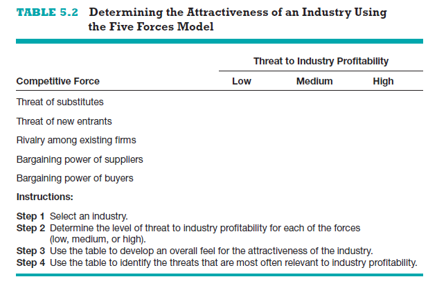 First, the five forces model can be used to assess the attractiveness of an industry or a specific position within an industry by determining the level of threat to industry profitability for each of the forces, as shown in Table 5.2. This analysis of industry attractiveness should be more in-depth than the less rigorous analysis conducted during feasibility analysis. For example, if a firm filled out the form shown in Table 5.2 and several of the threats to industry profitability were high, the firm may want to reconsider entering the industry or think carefully about the position it will occupy in the industry. In the res- taurant industry, for example, the threat of substitute products, the threat of new entrants, and the rivalry among existing firms are high. For certain res- taurants, such as fresh-seafood restaurants, the bargaining power of suppliers may also be high (the number of seafood suppliers is relatively small compared to the number of beef and chicken suppliers). Thus, a firm that enters the restaurant industry has several forces working against it simply because of the nature of the industry. To help sidestep or diminish these threats, it must establish a favorable position. One firm that has accomplished this is Panera Bread, as discussed in Case 5.1 at the end of this chapter. By studying the restaurant industry, Panera found that some consumers have tired of fast food but don’t always have the time to eat at a sit-down restaurant. To fill the gap, Panera helped to pioneer a new category called “fast casual,” which combines relatively fast service with high-quality food. Panera has been very successful in occupying this unique position in the restaurant industry. You’ll learn more about Panera Bread’s success while reading Case 5.1.