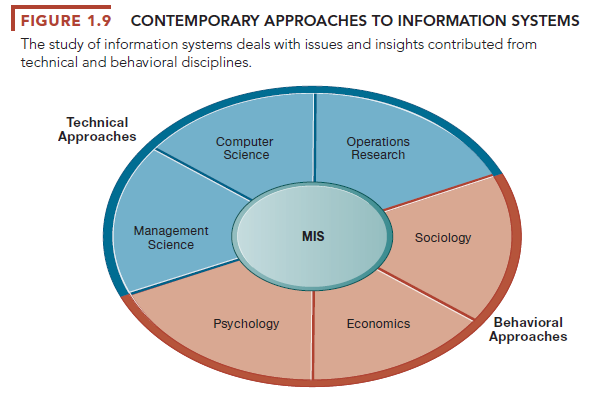 The study of information systems is a multidisciplinary field. No single theory or perspective dominates. Figure 1.9 illustrates the major disciplines that contribute problems, issues, and solutions in the study of information systems. In general, the field can be divided into technical and behavioral approaches. Information systems are sociotechnical systems. Though they are composed of machines, devices, and “hard” physical technology, they require substantial social, organizational, and intellectual investments to make them work properly.