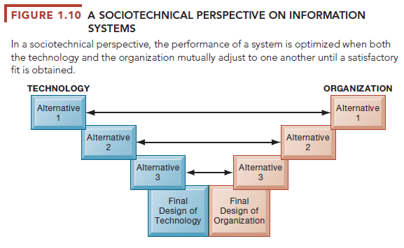 In this book, we stress the need to optimize the firm’s performance as a whole. Both the technical and behavioral components need attention. This means that technology must be changed and designed in such a way as to fit organizational and individual needs. Sometimes, the technology may have to be “de-optimized” to accomplish this fit. For instance, mobile phone users adapt this technology to their personal needs, and as a result manufacturers quickly seek to adjust the technology to conform to user expectations. Organizations and individuals must also be changed through training, learning, and planned organizational change to allow the technology to operate and prosper. Figure 1.10 illustrates this process of mutual adjustment in a sociotechnical system.