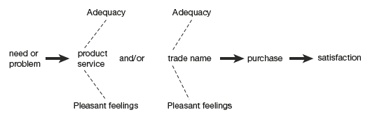 In buying anything, the purchaser proceeds mentally from need or problem to product or service, to trade name, to purchase, and, upon using the product or service, he or she experiences satisfaction or dissatisfaction. Thus, when a definite buying habit has been established, the buying formula is: