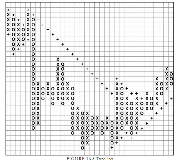Trend lines in three-box reversal charts are drawn at 45-degree angles, as demonstrated in Figure 16.8. This method is somewhat spurious. There is little reason for drawing trend lines in this manner, but regardless, it has become the convention for these charts.