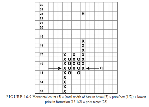 The horizontal count is similar to the count in a one-box chart. The walls on either side of the base are the starting points, and the distance in boxes is measured between them. In Figure 16.9, the width of the base is 5. The distance is then multiplied by the dollars per box. In Figure 16.9, the price per box is 0.5 at the point where the base is formed. The base of 5 is multiplied by the price per box of .5 to get 2.5. Next, an adjustment is made to account for the approximate loss in price action using a three-box reversal; in our example, 2.5 is multiplied by 3 because the reversal amount is three boxes, resulting in 7.5. This figure is then added to the lowest point in the formation, which in our example is 15 1/2, giving a price target on a bullish signal of 23 (15 1/2 + 7 1/2). The fact that at 23, the box sizes are one point per box is irrelevant. Remember that this is different from the count in a one-box chart, where all boxes are the same size.