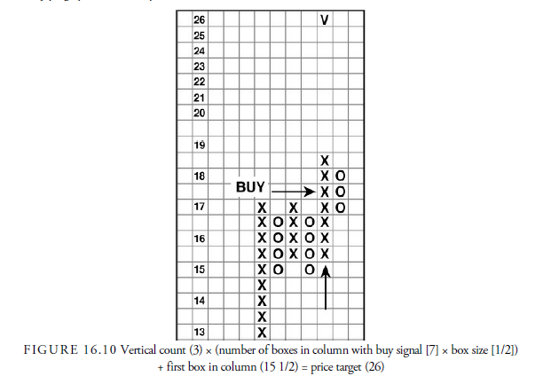 The vertical count is unique to the three-box reversal. It is calculated by taking the number of boxes in the column in which an action signal has occurred, multiplying it by 3, and adding the product to the lowest box price in the column. If the box values are different because of scale changes during the column’s formation, the value of the column boxes must be adjusted. In the example (see Figure 16.10), the scale does not change over the relevant range. Thus, the prices are all 1/2 point per box for seven boxes in the column in which the buy signal occurred, multiplied by 3 to adjust for the three-box reversal, which equals 10 1/2, which is then added to the lowest box price of 15 1/2 to get a vertical count of 26. In some cases, the initial signal is only a three- box column. If the base is sufficiently large, the two columns coming out of the base at the signal can be used. A special situation exists in short sales from a top. In these cases, the downward projection is a function of multiplying by 2 instead of by 3.