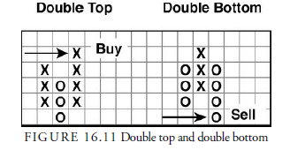Double tops and bottoms are the simplest of all patterns. The double pattern consists of only three columns: two X columns and one O column for the double top or two O columns and one X column for the double bottom. The nomenclature is different from both bar charts and one-box point and figure charts in that “top” designates the point at which a breakout occurs rather than a description of the pattern formation as being bearish. Indeed, a top—double or triple—is a bullish formation once the upward breakout occurs. The signal comes when the third column breaks above or below the first column, as shown in Figure 16.11. All other standard formations with the exception of lines have a double top or bottom within them. Davis found the double top to be profitable 80.3% of the time and the double bottom to be profitable 82.1% of the time. Anderson found their combined profitability to be tied for third best of the eight patterns, returning $1,371,810 in 18,278 trades over nine years.