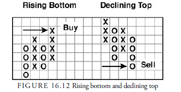 The rising bottom and declining top are variations of the double top and double bottom. Four columns are required for these formations. The rising bottom is formed by an initial X column, followed by an O column, a second X column, and then a second O column. For the pattern to be a rising bottom, the first column of Os in the double top must have a lower low than the most recent column of Os. The rising bottom pattern is pictured in Figure 16.12.