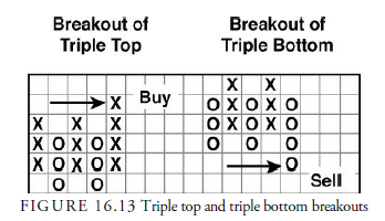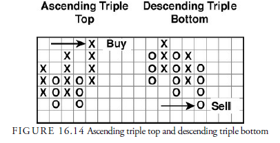 The descending triple bottom is the opposite of the top. In this formation, the three rows of Os show progressively lower levels. Figure 16.14 also shows this bottom formation.