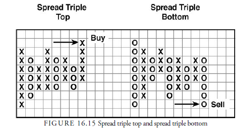 The spread triple top (bottom) is a special case of the triple top (bottom). Spread triple tops and bottoms are a little more complicated, and, thus, occur less frequently. The pattern requires at least six columns and usually more. It is somewhat similar to the fulcrum pattern in the one-box chart because it has a congestion area followed by a premature breakout and then another congestion area. The signal comes when the premature breakout is exceeded, just as in the fulcrum pattern.