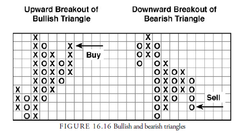 The triangle in three-box reversal charts is similar to the symmetrical triangle we saw in bar chart patterns in Chapter 15. Figure 16.16 depicts both a bullish and bearish three-box reversal triangle. The triangle is rare in three-box reversals, however, because it is relatively complicated and because three-box reversals cover a longer period of time than it takes for most bar chart triangles to form. The three-box reversal, therefore, only picks up those triangles that form over a longer period and that are uncommon. The pattern requires that columns converge by having successively lower highs and higher lows, as depicted in Figure 16.16. It is important to note that a signal is not generated until a breach of a previous column occurs, rather than simply on the break of a trend line as would occur with bar chart symmetrical triangles.