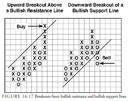 The general rule for these lines is that one should never buy unless prices are above the bullish support line and, conversely, should never sell unless prices are below the bearish resistance line. The initial lines may last for years, depending on the slope of the subsequent advance or decline. When a price penetrates a trend line by one box at the same time that a pattern signal occurs, the signal has added importance. Unfortunately, the tests on signals did not include this qualification.
