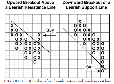 Because the method only allows one upward and one downward trend line, each has a separate name. The upward trend line, drawn one box below the last observable column (always an O column) after a buy signal from a base, is called the bullish support line. The opposite, the down trend line drawn one box above the latest top column (always an X column) after a sell signal from a top, is called the bearish resistance line. Each is treated equivalently relative to its direction.
