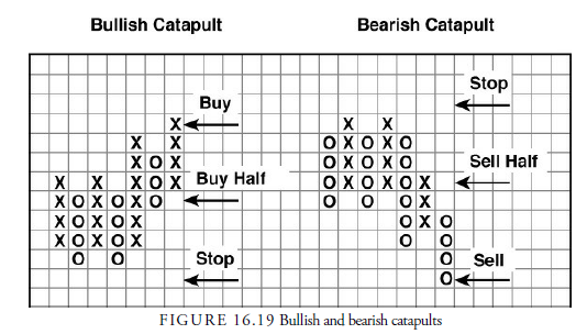 Figure 16.19 depicts a bullish catapult. In this chart, the triple breaks out in the third column of Xs. A column of Os follows, in a throwback. As the next column of Xs occurs, a double formation then occurs.
