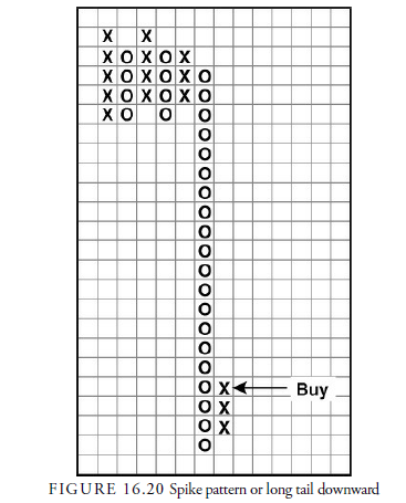 The main question to be resolved is how far the straight line run in prices has to travel before it is considered a spike. Cohen argued that 10 boxes were sufficient to establish a spike; Blumenthal argued for 20 boxes; and Burke reported that 17-20 would be sufficient. Dorsey mentions a “long tail down,” using a decline of 20 boxes without a reversal as his criterion; at the first reversal, he suggests a buy for a short trade on the long side. In summary, however, the answer is not clear as what the best number of boxes is, but the principle is valid especially if the overall market is at a long-term extreme.
