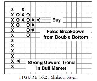 The shakeout pattern is a deceptive one that plays on traders and investors who sell on the first sign of difficulty in an uptrend. It is displayed in Figure 16.21. The first column of Xs indicates a strong upward trend. Then the two columns of Os form a double bottom. This double bottom breakdown in a strong rising market often “shakes out” a number of traders and investors who have profited and want to exit the position. Under normal circumstances, the double bottom pattern would be a signal to sell, but in this case, it pays to buy instead of sell. The reason is that the trend is still upward, and the first correction is just temporary within a trend that will soon resume upward.
