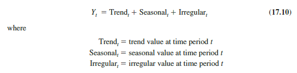 Time series decomposition methods assume that Y,, the actual time series value at period t, is a function of three components: a trend component; a seasonal component; and an irregular or error component. How these three components are combined to generate the observed values of the time series depends upon whether we assume the relationship is best described by an additive or a multiplicative model.