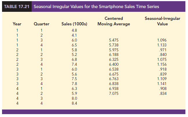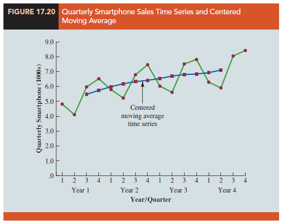 Figure 17.18 indicates that sales are lowest in the second quarter of each year and increase in quarters 3 and 4. Thus, we conclude that a seasonal pattern exists for the smartphone sales time series. The computational procedure used to identify each quarter’s seasonal influence begins by computing a moving average to remove the combined seasonal and irregular effects from the data, leaving us with a time series that contains only trend and any remaining random variation not removed by the moving average calculations.
