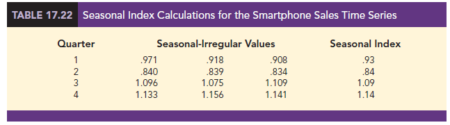 We refer to 1.09 as the seasonal index for the third quarter. Table 17.22 summarizes the calculations involved in computing the seasonal indexes for the smartphone sales time series. The seasonal indexes for the four quarters are .93, .84, 1.09, and 1.14.