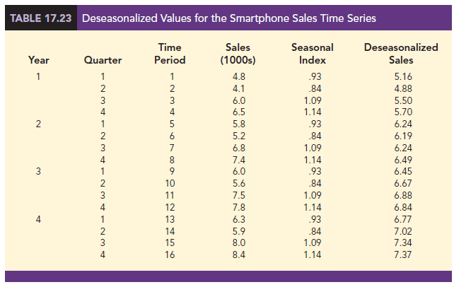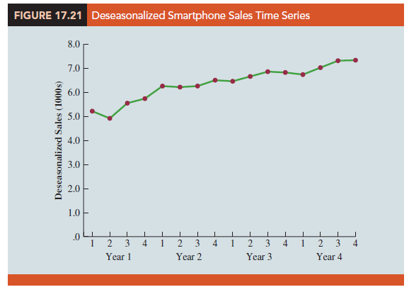 So, when we divide each time series observation (Yt) by its corresponding seasonal index, the resulting data show only trend and random variability (the irregular component). The deseasonalized time series for smartphone sales is summarized in Table 17.23. A graph of the deseasonalized time series is shown in Figure 17.21.