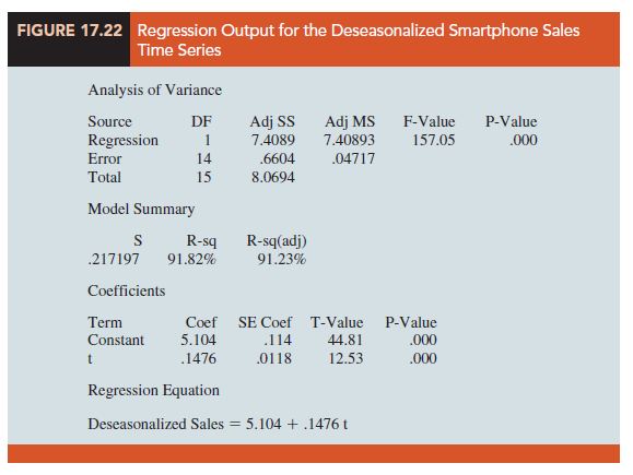 Figure 17.22 shows a portion of the computer output obtained using regression analysis to estimate the trend line for the deseasonalized smartphone time series. The estimated linear trend equation is