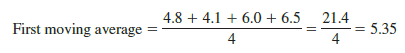 Note that the moving average calculation for the first four quarters yields the average quarterly sales over year 1 of the time series. Continuing the moving average calculations, we next add the 5.8 value for the first quarter of year 2 and drop the 4.8 for the first quarter of year 1. Thus, the second moving average is