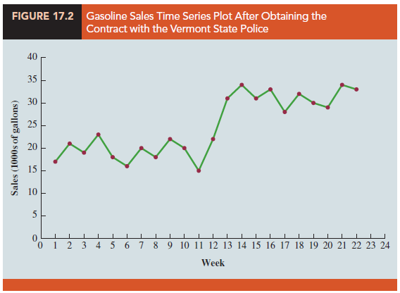 Changes in business conditions can often result in a time series that has a horizontal pattern shifting to a new level. For instance, suppose the gasoline distributor signs a contract with the Vermont State Police to provide gasoline for state police cars located in southern Vermont. With this new contract, the distributor expects to see a major increase in weekly sales starting in week 13. Table 17.2 shows the number of gallons of gasoline sold for the original time series and for the 10 weeks after signing the new contract. Figure 17.2 shows the corresponding time series plot. Note the increased level of the time series beginning in week 13. This change in the level of the time series makes it more difficult to choose an appropriate forecasting method. Selecting a forecasting method that adapts well to changes in the level of a time series is an important consideration in many practical applications.