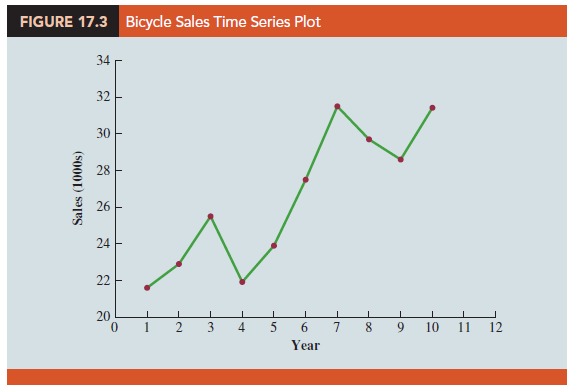 To illustrate a time series with a trend pattern, consider the time series of bicycle sales for a particular manufacturer over the past 10 years, as shown in Table 17.3 and Figure 17.3. Note that 21,600 bicycles were sold in year one, 22,900 were sold in year two, and so on. In year 10, the most recent year, 31,400 bicycles were sold. Visual inspection of the time series plot shows some up and down movement over the past 10 years, but the time series also seems to have a systematically increasing or upward trend.
