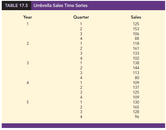 As an example of a seasonal pattern, consider the number of umbrellas sold at a clothing store over the past five years. Table 17.5 shows the time series and Figure 17.5 shows the corresponding time series plot. The time series plot does not indicate any long-term trend in sales. In fact, unless you look carefully at the data, you might conclude that the data follow a horizontal pattern. But closer inspection of the time series plot reveals a regular pattern in the data. That is, the first and third quarters have moderate sales, the second quarter has the highest sales, and the fourth quarter tends to have the lowest sales volume. Thus, we would conclude that a quarterly seasonal pattern is present.