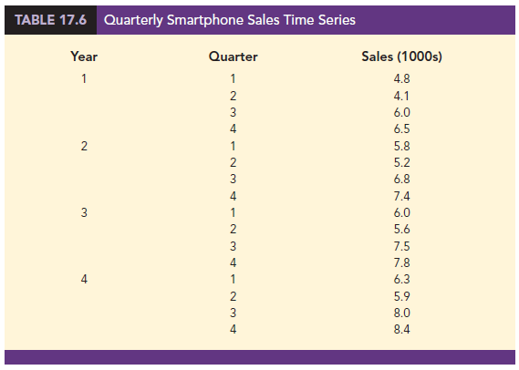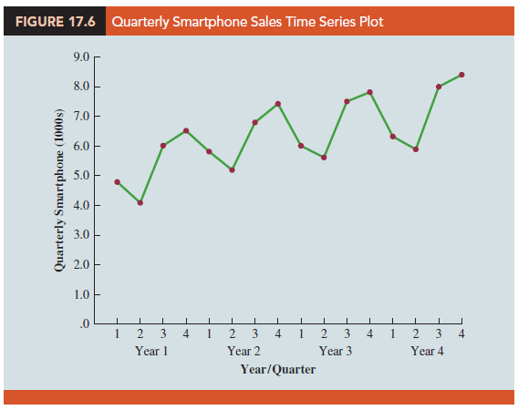 Some time series include a combination of a trend and seasonal pattern. For instance, the data in Table 17.6 and the corresponding time series plot in Figure 17.6 show smartphone sales for a particular manufacturer over the past four years. Clearly, an increasing trend is present. But, Figure 17.6 also indicates that sales are lowest in the second quarter of each year and increase in quarters 3 and 4. Thus, we conclude that a seasonal pattern also exists for smartphone sales. In such cases we need to use a forecasting method that has the capability to deal with both trend and seasonality.