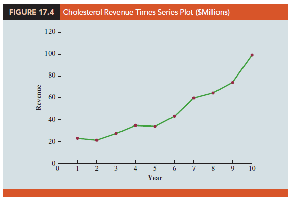 The trend for the bicycle sales time series appears to be linear and increasing over time, but sometimes a trend can be described better by other types of patterns. For instance, the data in Table 17.4 and the corresponding time series plot in Figure 17.4 show the sales for a cholesterol drug since the company won FDA approval for it 10 years ago. The time series increases in a nonlinear fashion; that is, the rate of change of revenue does not increase by a constant amount from one year to the next. In fact, the revenue appears to be growing in an exponential fashion. Exponential relationships such as this are appropriate when the percentage change from one period to the next is relatively constant.