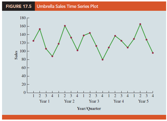 As an example of a seasonal pattern, consider the number of umbrellas sold at a clothing store over the past five years. Table 17.5 shows the time series and Figure 17.5 shows the corresponding time series plot. The time series plot does not indicate any long-term trend in sales. In fact, unless you look carefully at the data, you might conclude that the data follow a horizontal pattern. But closer inspection of the time series plot reveals a regular pattern in the data. That is, the first and third quarters have moderate sales, the second quarter has the highest sales, and the fourth quarter tends to have the lowest sales volume. Thus, we would conclude that a quarterly seasonal pattern is present.