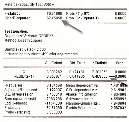 Since the CM statistic (62.159) is significant, we reject the null hypothesis that there is no first- order ARCH effects. Note that the LM statistic in EViews is calculated as LM = TxR2 = 499×0.124568=62.16. Furthermore, the F- and t-statistics (62.16 = 8.40952) corroborate the presence of first order ARCH effects.