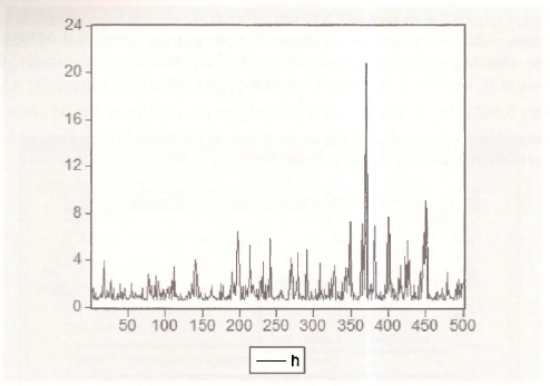 The top section is the mean equation. It shows that the average return is 1.063939. The lower section is the variance equation that gives the result of the ARCH model, namely, that the time varying volatility ht includes a constant component (0.642140) plus a component which depends on past errors. The shaded line highlights the significant ARCH effects.