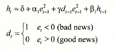 When y = 0, the model collapses to the standard GARCH form. Otherwise, when the shock is positive (i.e. good news) the effect on volatility is a, but when the news is negative (i.e. bad news) the effect on volatility is a, + y . Hence, so long as y is significant and positive, negative shocks have a larger effect on ht than positive shocks.
