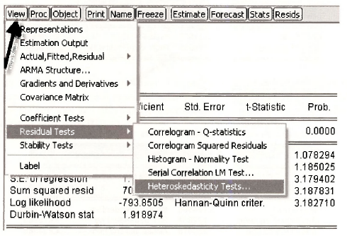 To generate the regression residuals, select View, select Residual Tests/Heteroskedasticity Tests from the drop down menus.