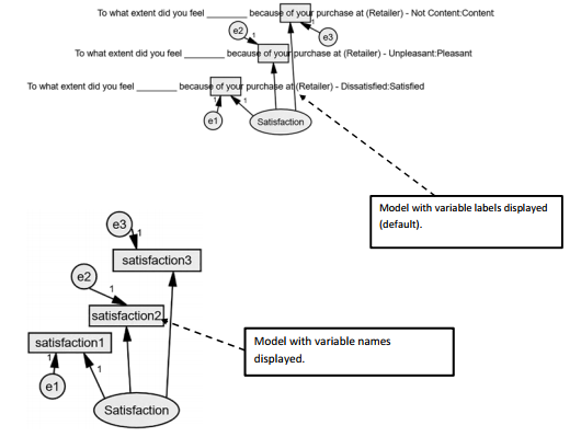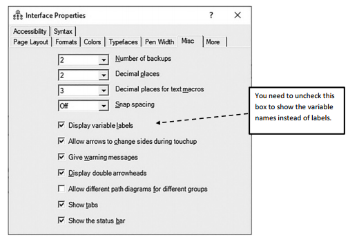 Tip 2: DisplayVariable Names Instead of Labels. When you drag a variable from the variable list into the AMOS graphics window, the variable will be displayed as its label in AMOS. The label is often where you will see the actual question asked in a survey. Hence, instead of just listing a short name for each variable, you have a huge variable label that lists the whole question asked. To have AMOS change from displaying vari- able labels in the graphics window to displaying the variable name, you need to go to the interface properties window. In the tab at the top called “Misc”, you will see a series of checkboxes that are already checked. One of those checkboxes is “Display Variable Labels”.You want to uncheck this box. By doing this, the variable name will now be displayed instead of the label.