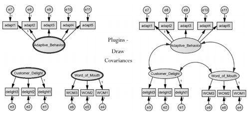 Tip 5: Let AMOS draw covariances between independent variables.All independent variables should have a covariance between them. If you have a large model, this can be quite a few covariances to add. If you select/highlight all the independent unobservable constructs (circles), then go to the “Plugins” menu option at the top and select “Draw Covariances”. This option will draw a covariance between all variables selected/highlighted. It is a good idea to hit the “deselect” button when you are done.