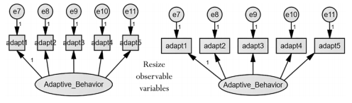 Tip 6: AMOS can resize all observables/indicators to fully show a variable name. The variable names for your indicators can vary wildly in length, and AMOS can help with the resizing of the boxes to fully show the variable names. In the “Plugins” menu at the top, select the “Resize Observed Variables”. This will change the size of all observable variables in the model to fully contain the variable name within the box. Instead of resizing observables/indicators after every construct that is added to the model, you can wait until all constructs are included in the model and use this function to resize all the boxes to fit the variable names.
