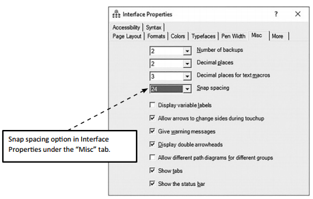 Tip 9: Force Objects in the GraphicsWindow to line up on a grid line. If you would like for all of your boxes or circles to be in a straight line down the graphics window, you need to use the option called “Snap Spacing”. In the Interface Properties window, you want to go to the “Misc” tab and then change the Snap Spacing option from “off ” to a number. When snap spacing is turned on, AMOS will include (invisible) grid lines in the graphics window and will space the gridlines out based on your preference. If you choose a snap spacing of 24, then AMOS will separate the grid lines by 24/96 = .25 inches apart. If you select a snap spacing of 12, then the separation is 12/96 = .125 inches apart. To turn the grid lines back off, just change Snap Spacing to “off ”. If you are researcher that likes to have your objects in the graphics window in an orderly pattern, then Snap Spac- ing will save you some time from trying to eyeball objects to be in line with one another.