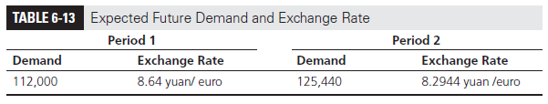 A simplistic approach often taken is to consider the expected movement of demand and exchange rates in future periods when evaluating discounted cash flows. The weakness of such an approach is that it averages the trends while ignoring the uncertainty. We start by considering such a simplistic approach for the onshoring and offshoring options. On average, demand is expected to increase by 12 percent [(20 X 0.8) – (20 X 0.2) = 12], whereas the yuan is expected to strengthen by 4 percent [(10 X 0.7) – (10 X 0.3) = 4] each year. The expected demand and exchange rates in the two future periods are shown in Table 6-13.