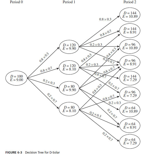 For this analysis we construct a decision tree, as shown in Figure 6-3. Each node in a given period leads to four possible nodes in the next period because demand and the exchange rate may go up or down. The detailed links and transition probabilities are shown in Figure 6-3. Demand is in thousands and is represented by D. The exchange rate is represented by E, where E is the number of yuan to a euro. For example, starting with the node D = 100, E = 9.00 in Period 0, one can transition to any of four nodes in Period 1. The transition to the node D = 120, E = 9.90 in Period 1 occurs if demand increases (probability of 0.8) and the yuan weakens (probability of 0.3). Thus, the transition from node D = 100, E = 9.00 in Period 0 to node D = 120, E = 9.90 in Period 1 occurs with probability 0.8 X 0.3 = 0.24. All other transition probabilities in Figure 6-3 are calculated in a similar manner. The main advantage of using a decision tree is that it allows for the true evaluation of profits in each scenario that D-Solar may find itself.