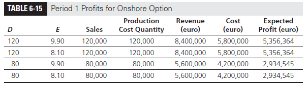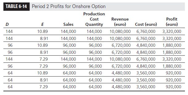 Recall that the onshore option is flexible and can change production levels (and thus variable costs) to match demand levels between 60,000 and 150,000. In the following analysis, we calculate the expected profits at each node in the decision tree (represented by the corresponding values of D and E) starting in Period 2 and working back to the present (Period 0). With the onshore option, exchange rates do not affect profits in euro because both revenue and costs are in euro.