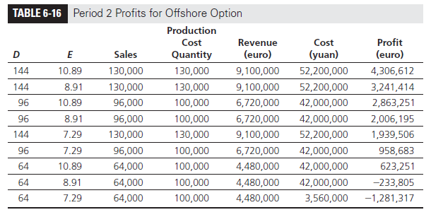 Using the same approach, we can evaluate the profit in each of the nine states (represented by the corresponding values of D and E) in Period 2 as shown in Table 6-16. Observe that the lack of flexibility at the offshore facility hurts D-Solar whenever demand is above 130,000 (lost margin) or below 100,000 (higher costs). For example, when the demand drops to 64,000 panels, the offshore facility continues to incur variable production costs for 100,000 panels. Profits are also hurt when the yuan is stronger than expected.