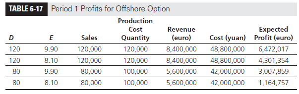 Observe that for the node D = 80, E = 8.10, D-Solar has a lower expected profit from the offshore option (Table 6-17) relative to the onshore option (see Table 6-15) because the offshore plant incurs high variable cost, given its lack of flexibility (cost is incurred for 100,000 units even though only 80,000 are sold), and all offshore costs become expensive, given the strong yuan.