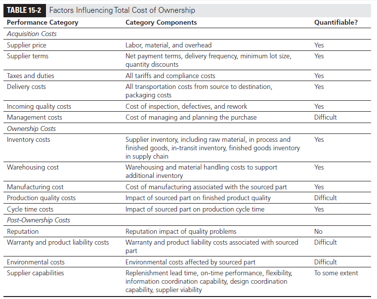 In each of these instances, the price charged by the supplier is only one of many factors that affect the supply chain surplus. It is important to focus on the total cost of ownership (TCO) when selecting suppliers. TCO includes all supply chain costs of sourcing a good or service from a particular supplier and can be considered in three “buckets”—acquisition costs, ownership costs, and post-ownership costs. Acquisition costs include all costs associated with the purchase of material from a supplier until it reaches the buyer and is ready for use. These costs include the supplier price, supplier terms affecting financing costs, taxes and duties, delivery costs, and incoming quality costs. Acquisition costs should also include the overhead of managing the relationship and planning the purchases. Ownership costs include all costs associated with the purchased part from when it arrives from the supplier to when the finished product is sold to the customer. These costs include inventory costs, warehousing costs, manufacturing or conversion costs, production quality costs, and production cycle time costs. Post-ownership costs include all costs incurred by the firm after the finished product has reached the end customer. These costs include warranty costs, environmental costs, product liability costs, and reputational costs. When scoring and assessing suppliers, one can organize the factors influencing total cost, as shown in Table 15-2.