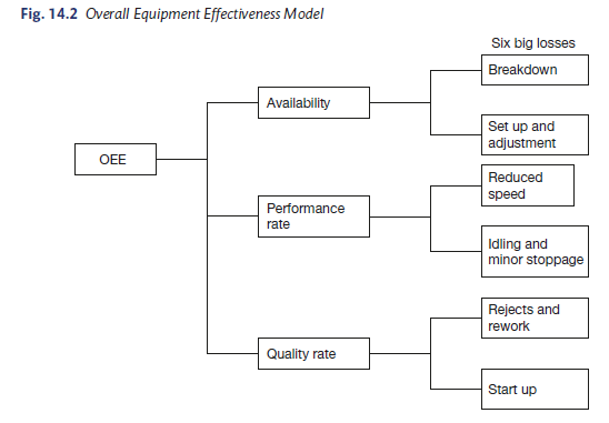 TPM strives to achieve OEE by maximizing output while minimizing input. The input consists of labour, machine and materials while the output consists of production (P), quality (Q), cost (c), delivery (D), safety, health and environment (S) and morale (M). TPM strives to maximize output (PQCDSM) by maintaining ideal operating conditions and running equipment effectively. To achieve OEE, TPM concentrates on eliminating “six big losses.” Figure 14.2 shows the OEE model.