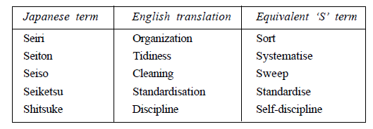 Employees has to discuss together and decide on standards for keeping the work place/ machines/pathways neat and clean. This standards are implemented for whole organization and are tested/inspected randomly.