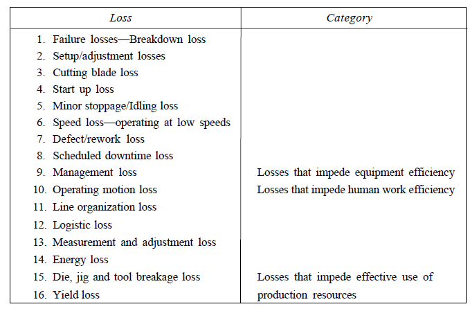 The objective of TPM is maximization of equipment effectiveness. TPM aims at maximization of machine utilization and not merely machine availability maximization. As one of the pillars of TPM activities, Kaizen pursues efficient equipment, operator and material and energy utilization, which is extremes of productivity and aims at achieving substantial effects. Kaizen activities try to thoroughly eliminate 16 major losses.